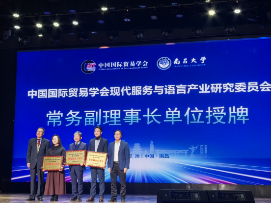 12月28日,中国国际贸易学会现代服务与语言产业研究委员会成立大会暨首届产教融合发展论坛在南昌大学举行。商务外语学院作为主要承办单位之一,全程深度参与本次盛会。学院副院长(主持工作)刘建珠率国际商务专业主任楼洁、骨干教师吴锋、高小雯一行出席会议并承担多项重要议程。